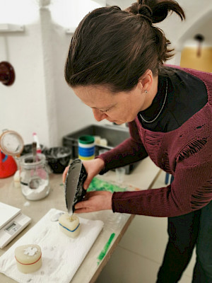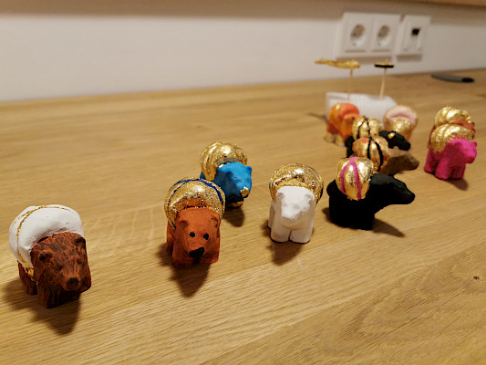 Mit Gips hat sich jeder einen eigenen Korbiniansbär gegossen. Diesen haben wir im Anschluss bemalt. Zudem haben wir gelernt, wie man etwas vergoldet. Das war gar nicht so einfach, aber das Ergebnis kann sich sehen lassen.