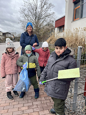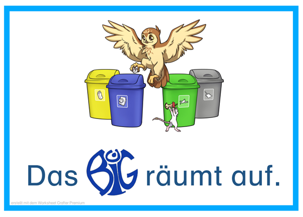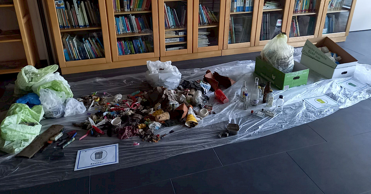 Deshalb haben sich die Klassen des BiG von Montag bis Mittwoch aufgemacht und rund um die Schule Müll gesammelt. Die Partnerklassen aus Eching hatten schon vor den Ferien gesammelt und die besonderen Fundstücke fotografisch festgehalten, wie eine Kloschüssel und ein kaputtes Kinderrad. Der Müll im BiG wurde am Mittwochnachmittag entsprechend sortiert und für eine Ausstellung vorbereitet. Am Donnerstag konnten dann die Klassen sich darüber wundern, was ihre Mitmenschen verantwortungslos wegwerfen – z.B. wurden viele Verpackungen aus Plastik gefunden, zwei Koffer, ein noch funktionables Wischgerät, viele Zigarettenkippen, Papier, Pappe, Böller, ein Ölfläschchen, Glas- und zum Teil Pfandflaschen,.