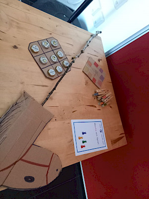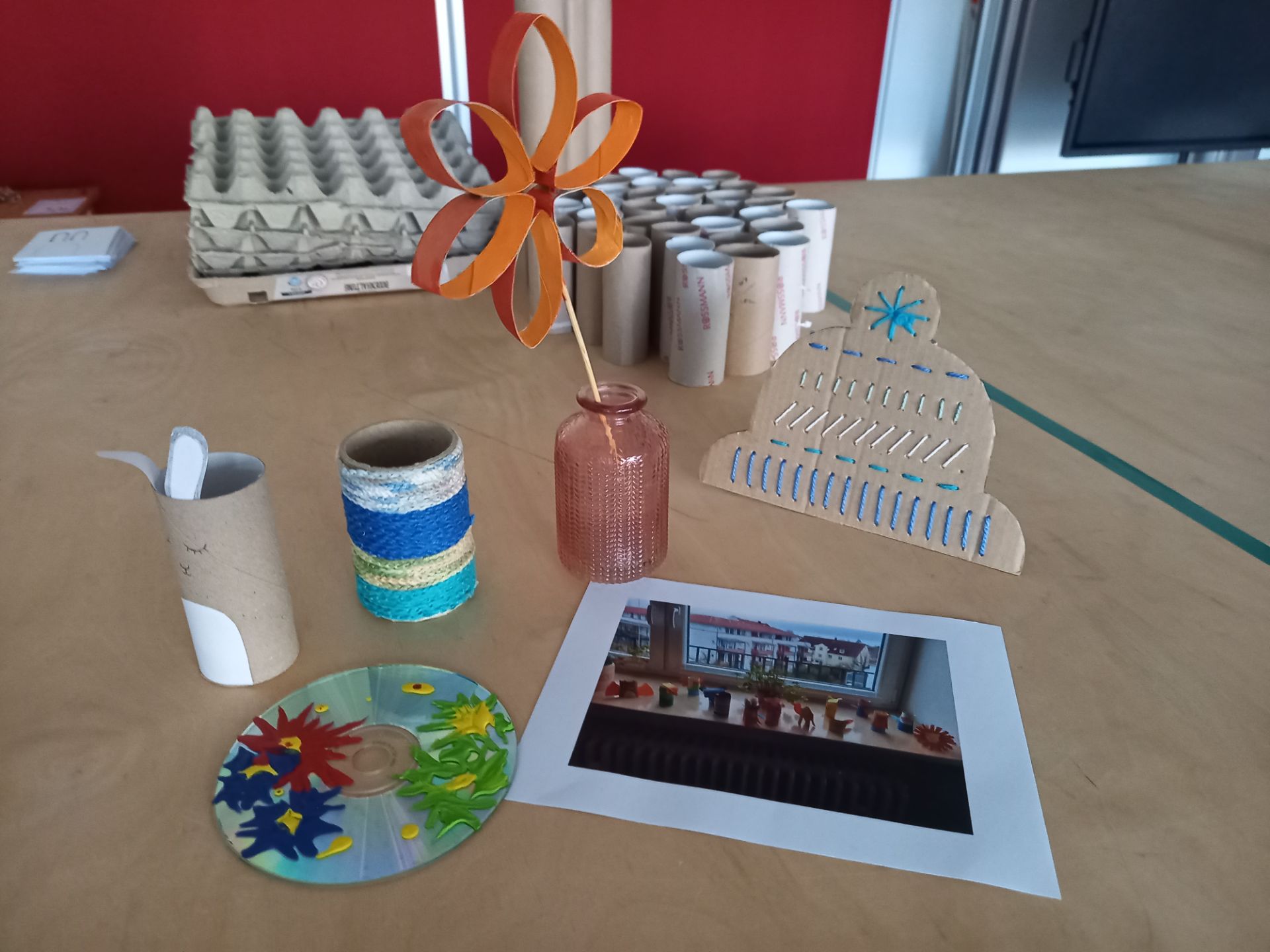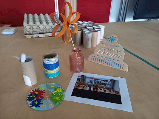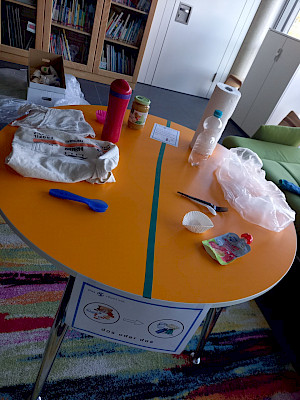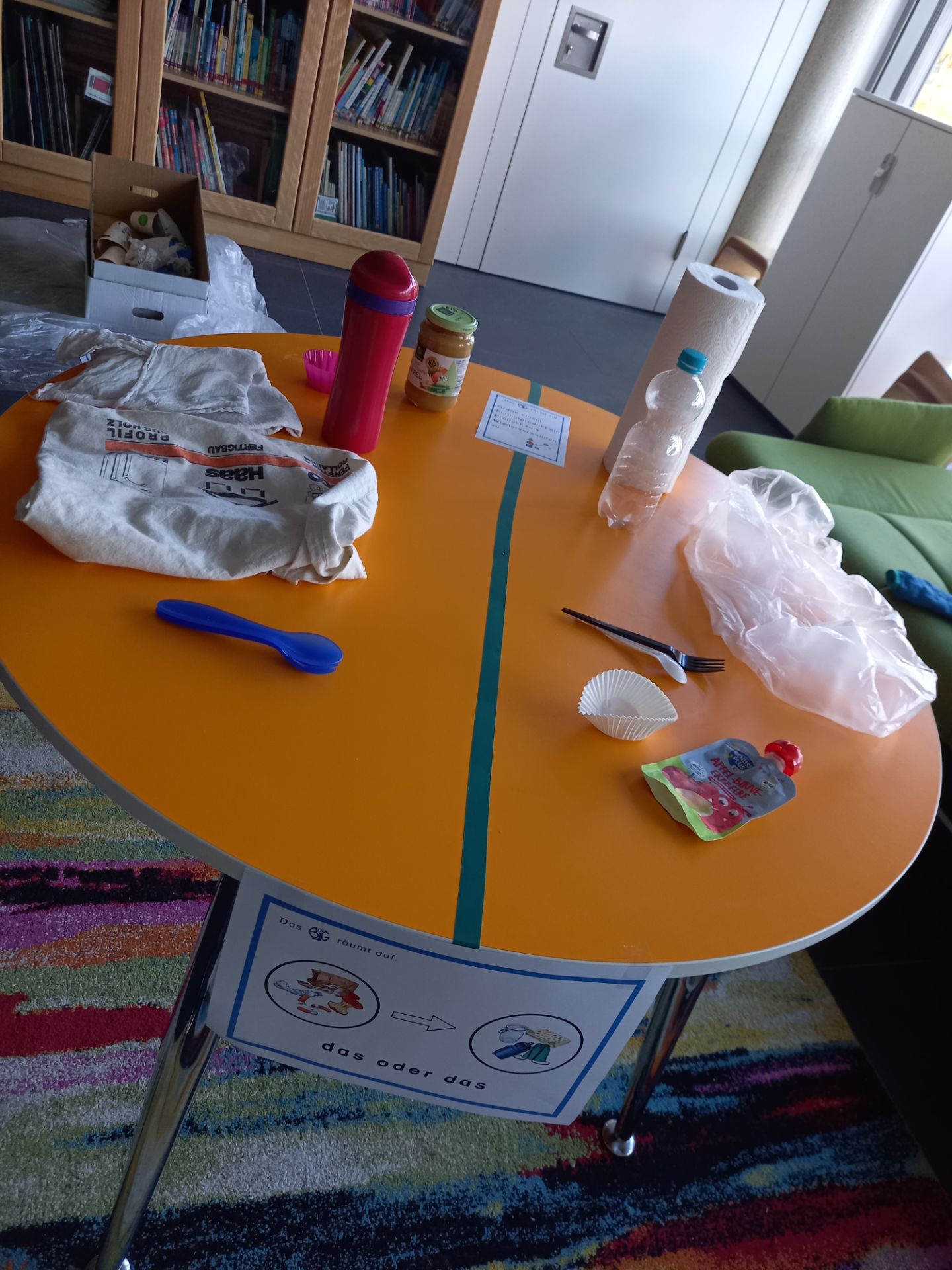 Dabei lernten die Schüler*innen, wie lang es brauchen würde, bis die Natur das Material wieder in seine Bestandteile zerlegt haben könnte oder teilweise eben auch nicht. Außerdem gab es eine Station zum Osterhasen-Basteln aus Klopapierrollen, Spiele aus Abfall-Materialien wie z.B. Dosenwerfen, Tic Tac Toe aus Kronkorken und einem Kartonstück, Musikinstrumente wie Rasseln, Kastagnetten, Trommeln und Regenrohre. An einem Tisch lagen verschiedene Verpackungen und Taschen, die sortiert werden konnten nach der Wiederverwendung. So gab es z.B. Stoffbeutel contra Plastiktüte, ein Quetschi contra Obstgläschen bzw. Obst am Stück.
