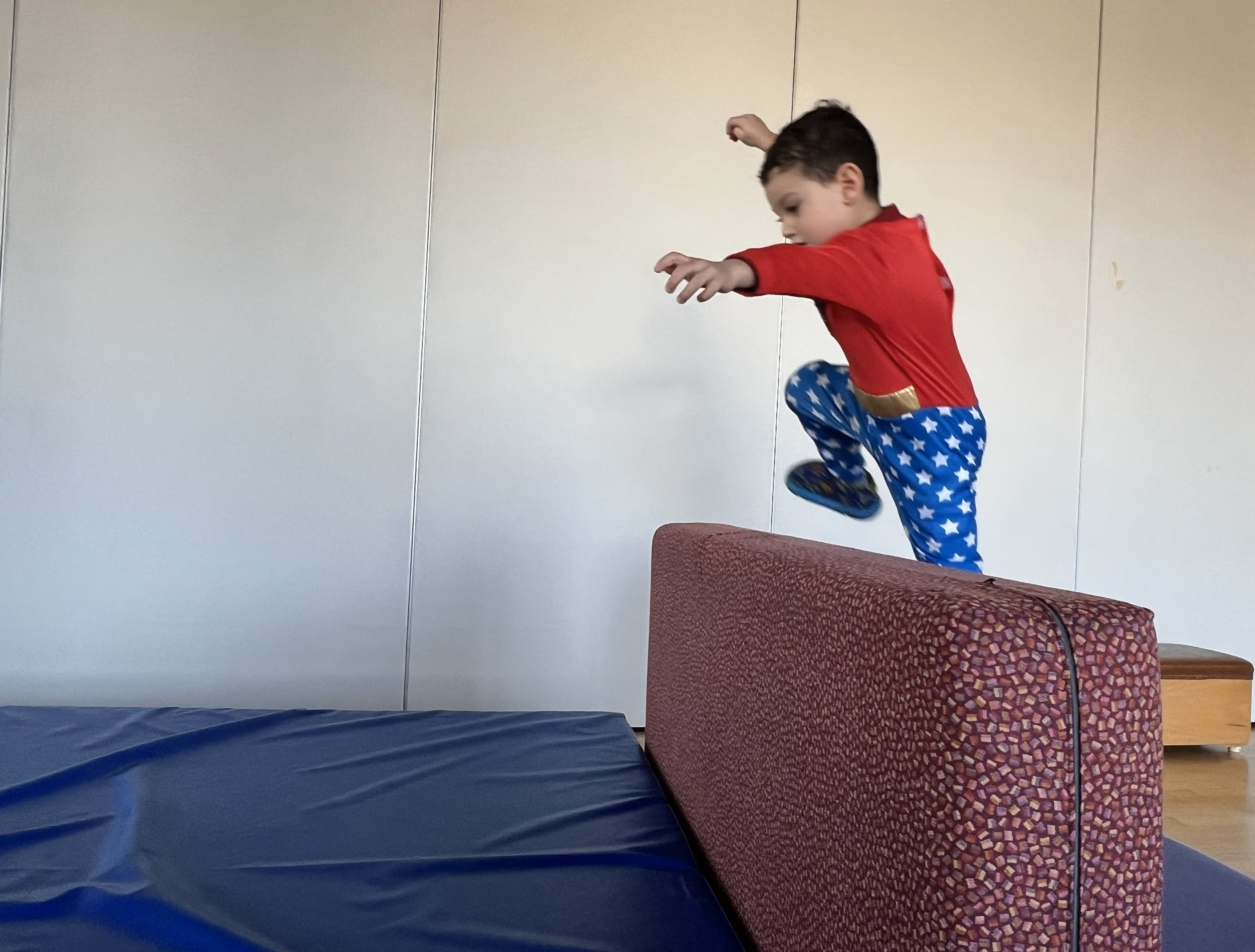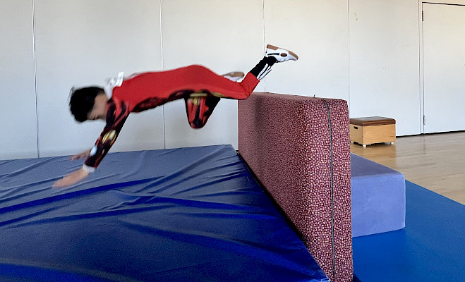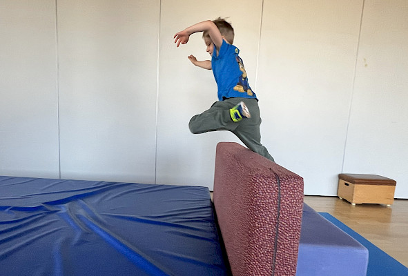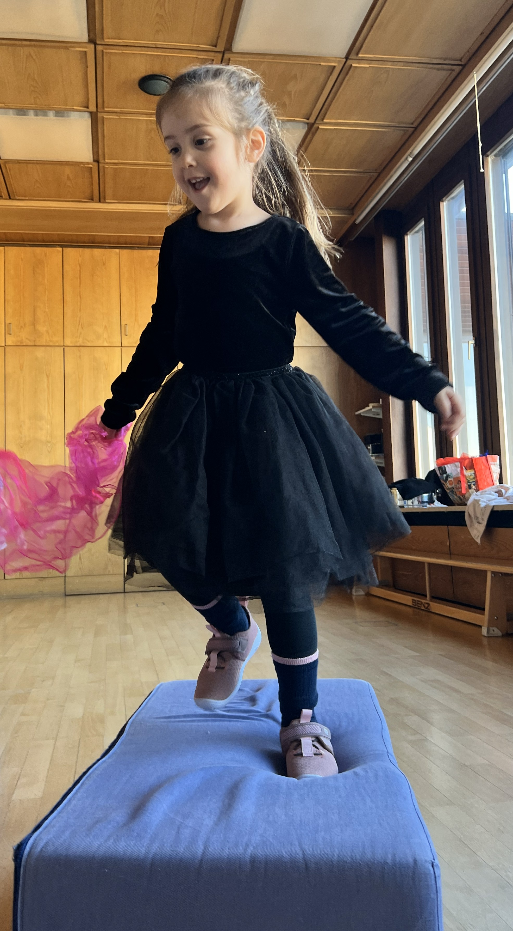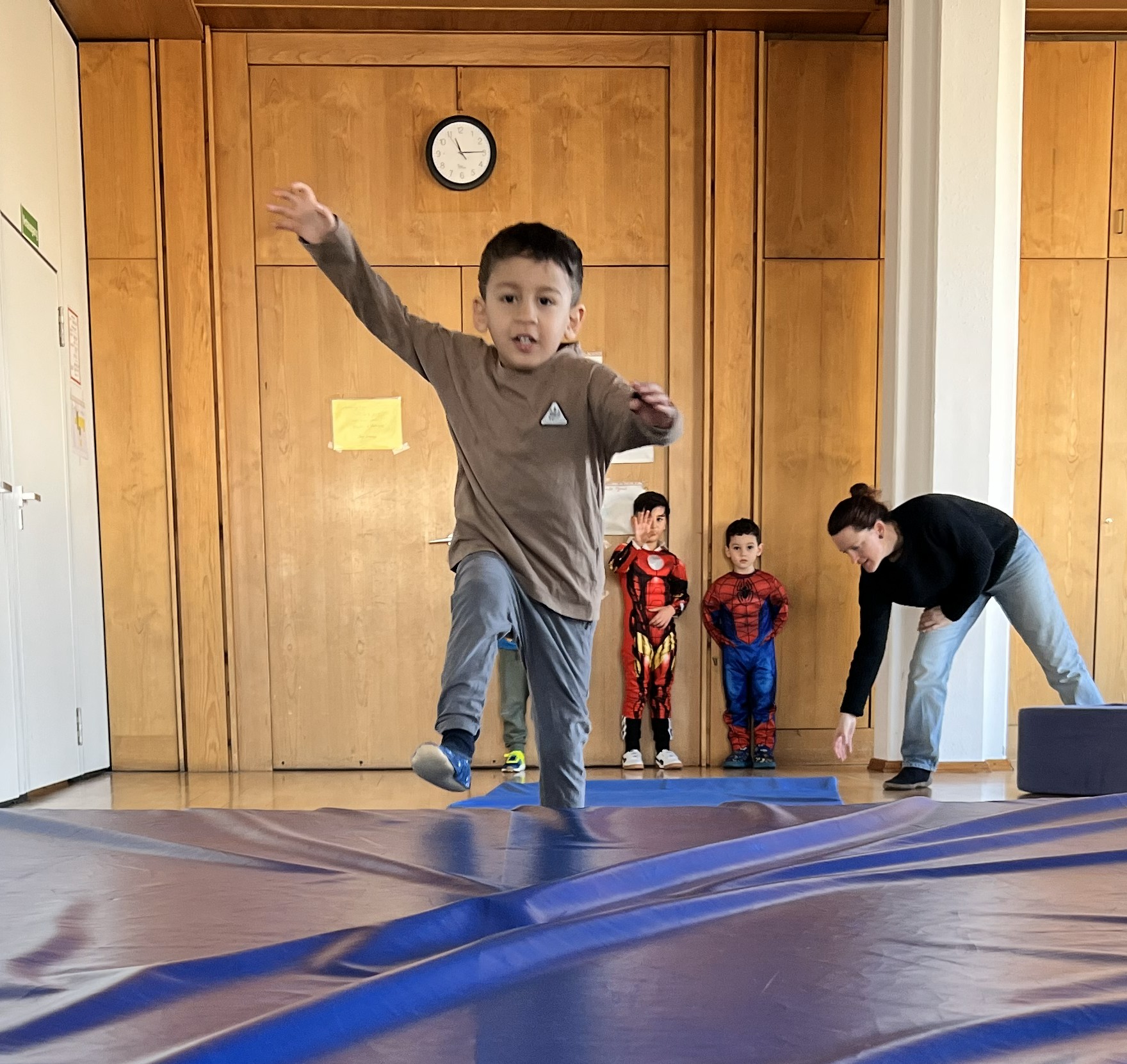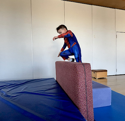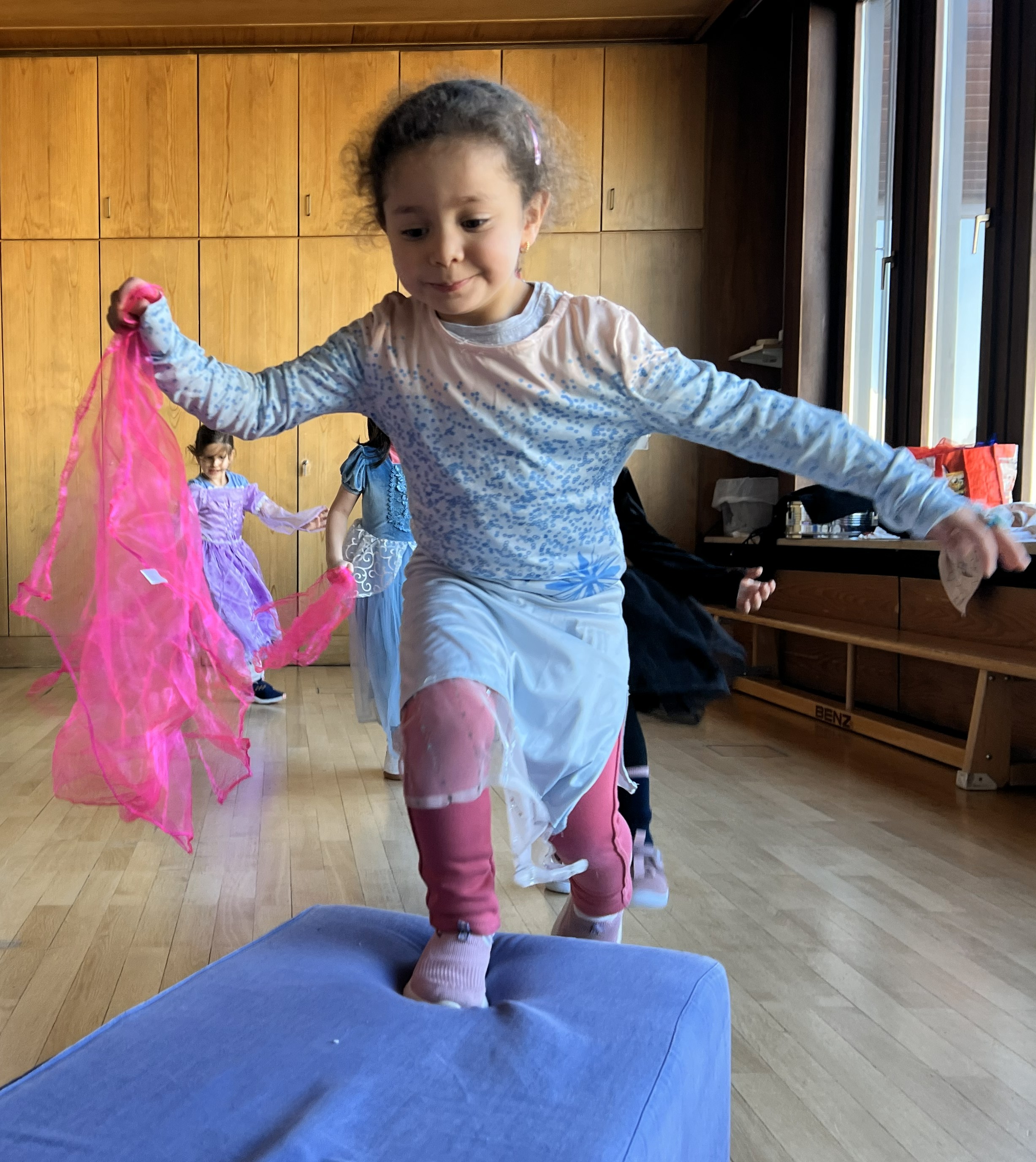 Die Superheld*innen sprangen mutig über Hindernisse, kletterten auf das Klettergerüst und landeten weich auf vielen Matten. Die Prinzess*innen tanzten mit bunten Tüchern durch die Halle und bewegten sich zur Musik. Es gab keine feste Geschichte, sondern viel Raum für eigene Ideen und Bewegung.