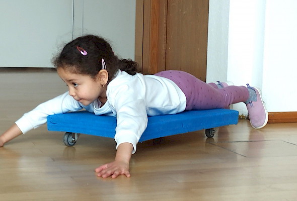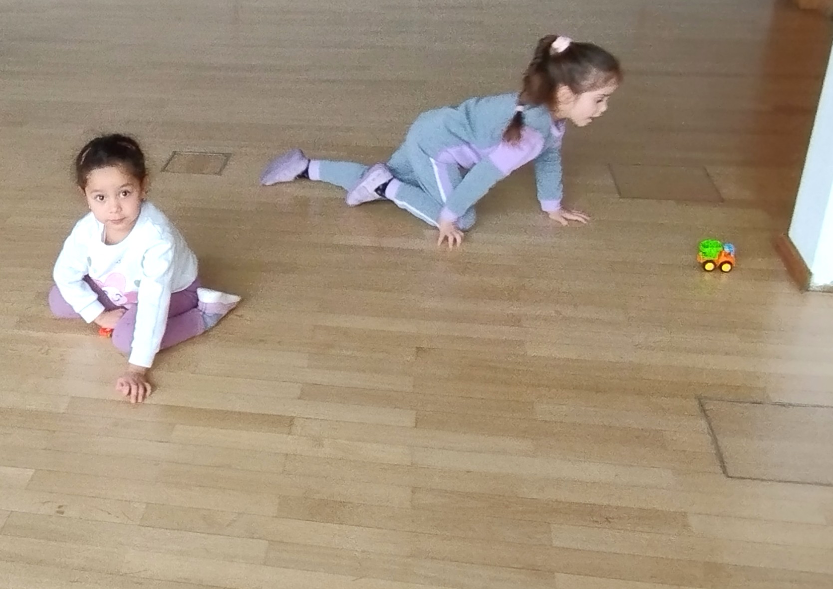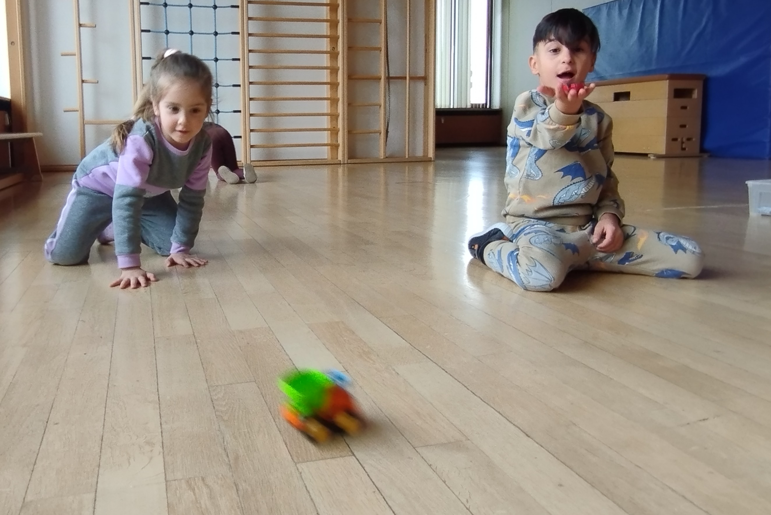 An einem anderen Tag fuhren die Kinder mit Matchbox-Autos und anderen Fahrzeugen durch die Turnhalle. Über kleine Strecken und durch Kurven sausten die Autos und sorgten für große Begeisterung. Auch hier stand das gemeinsame Spielen, Warten und Rücksichtnehmen im Mittelpunkt. Höhepunkte am Schluss waren verschiedene Wettrennen – Kinder gegen ihre Lieblingsautos und im Gruppen-Staffel-Lauf gegeneinander. Auch die beiden Erzieherinnen traten gegeneinander an, was für viele Lacher sorgte.