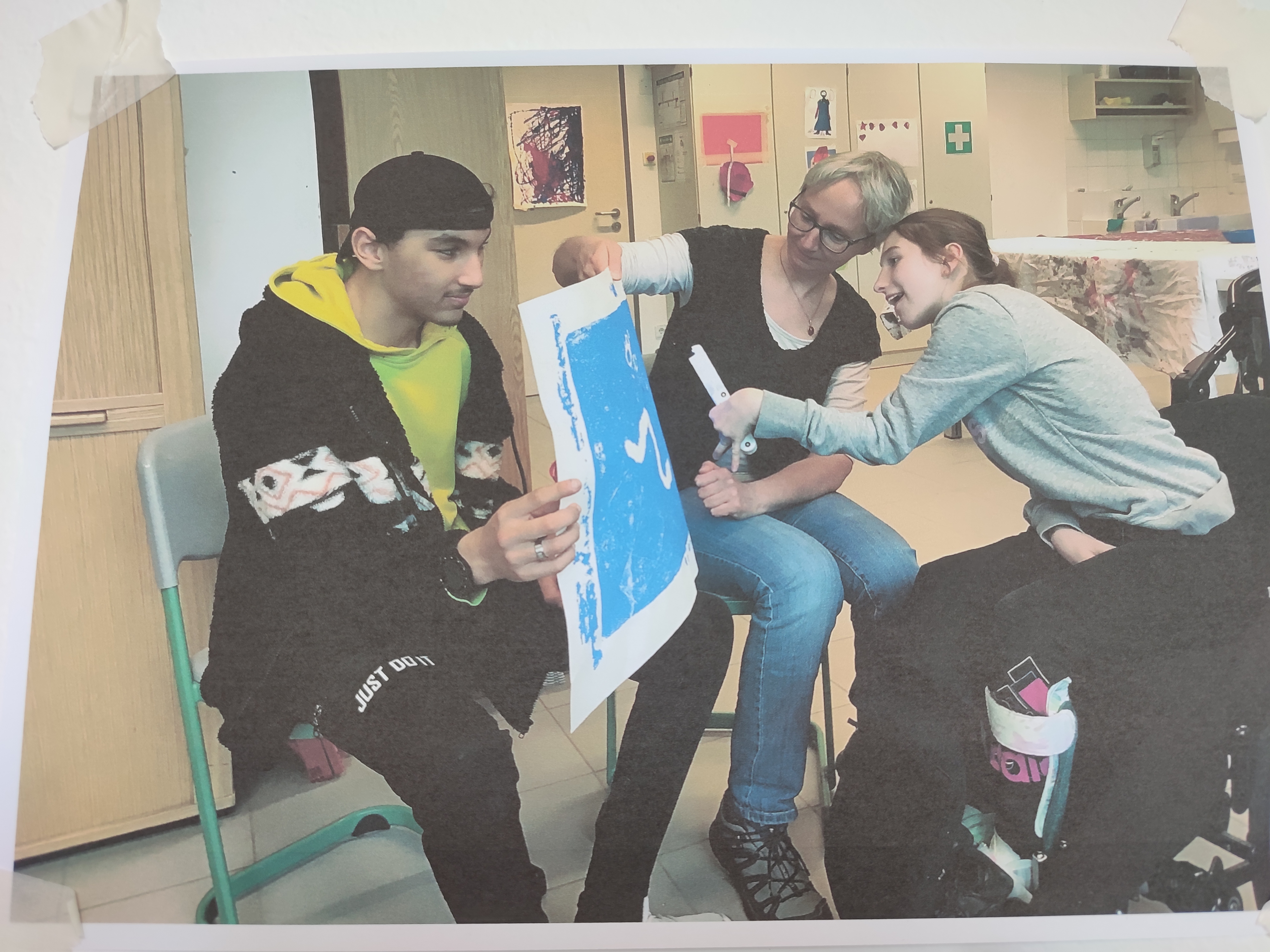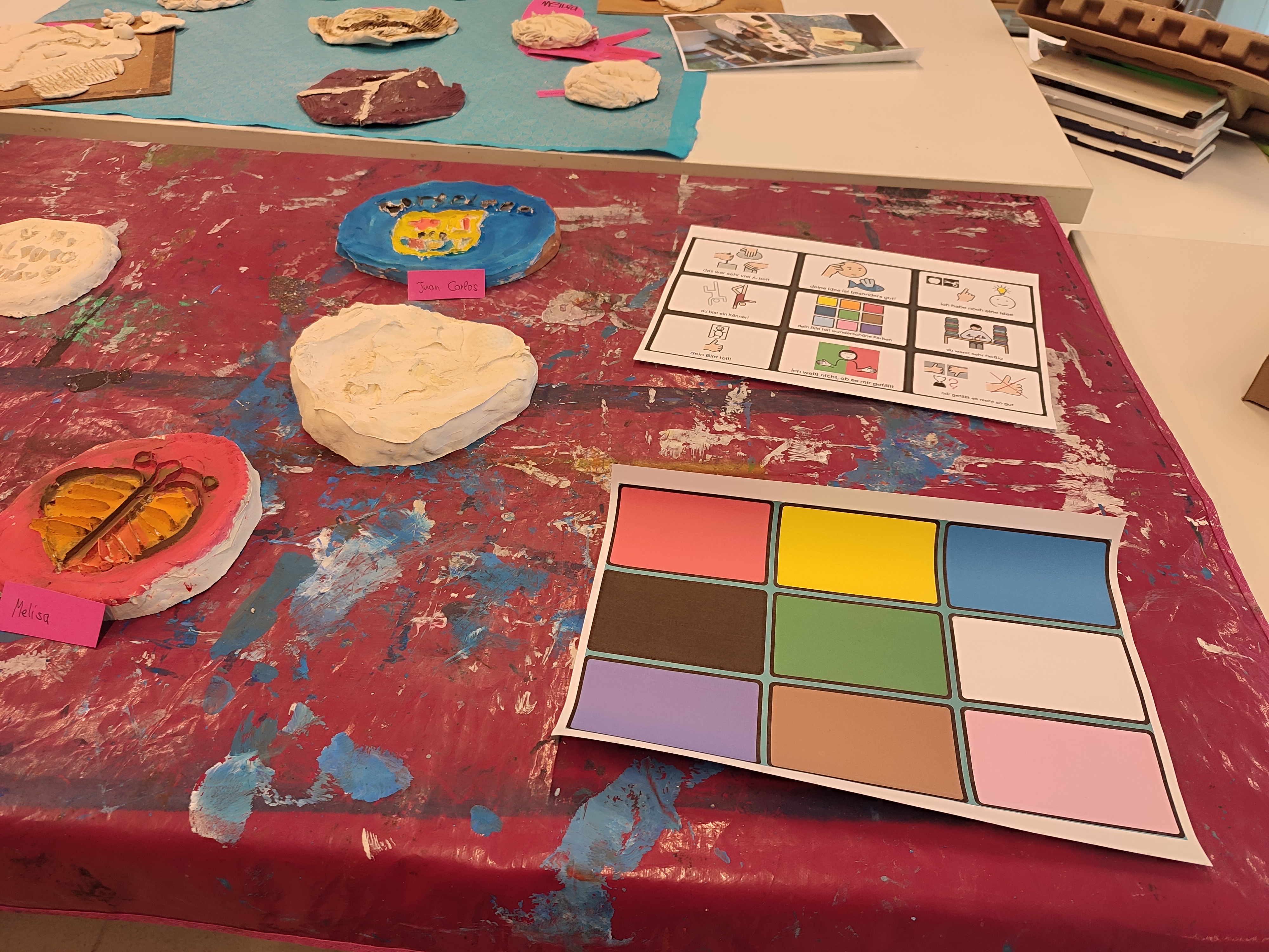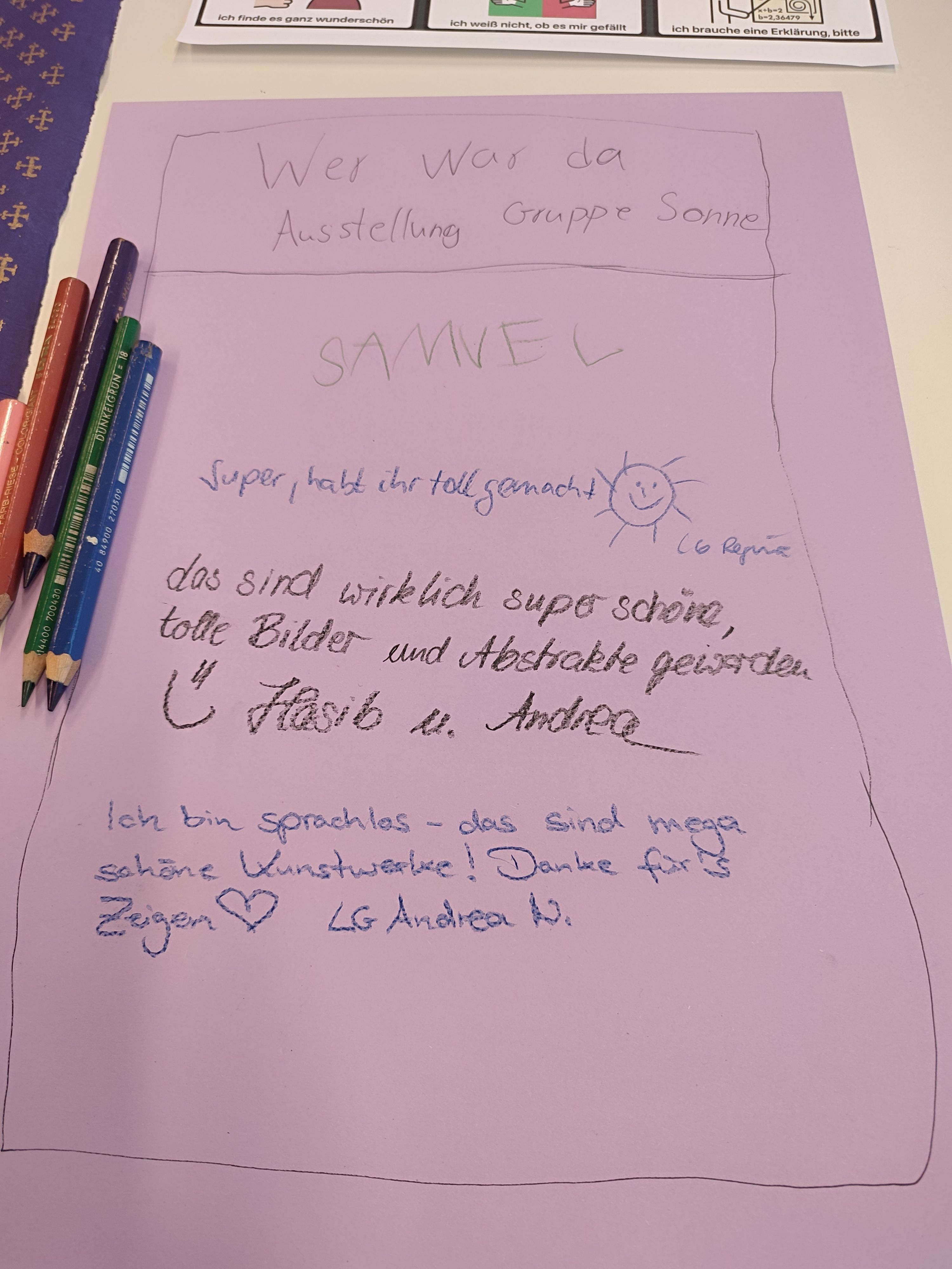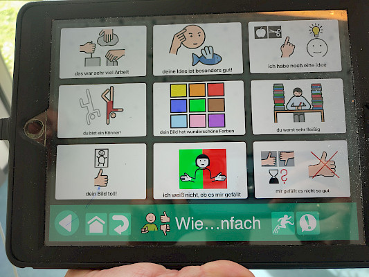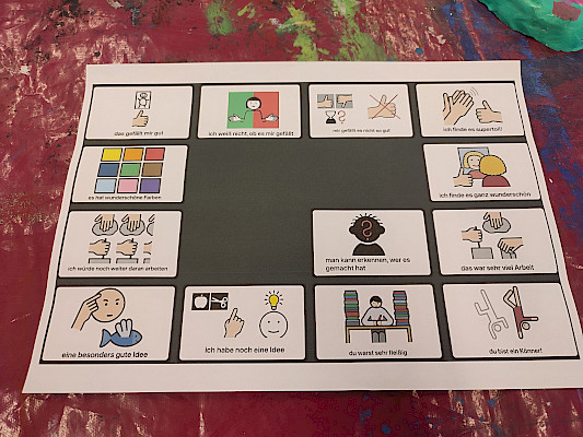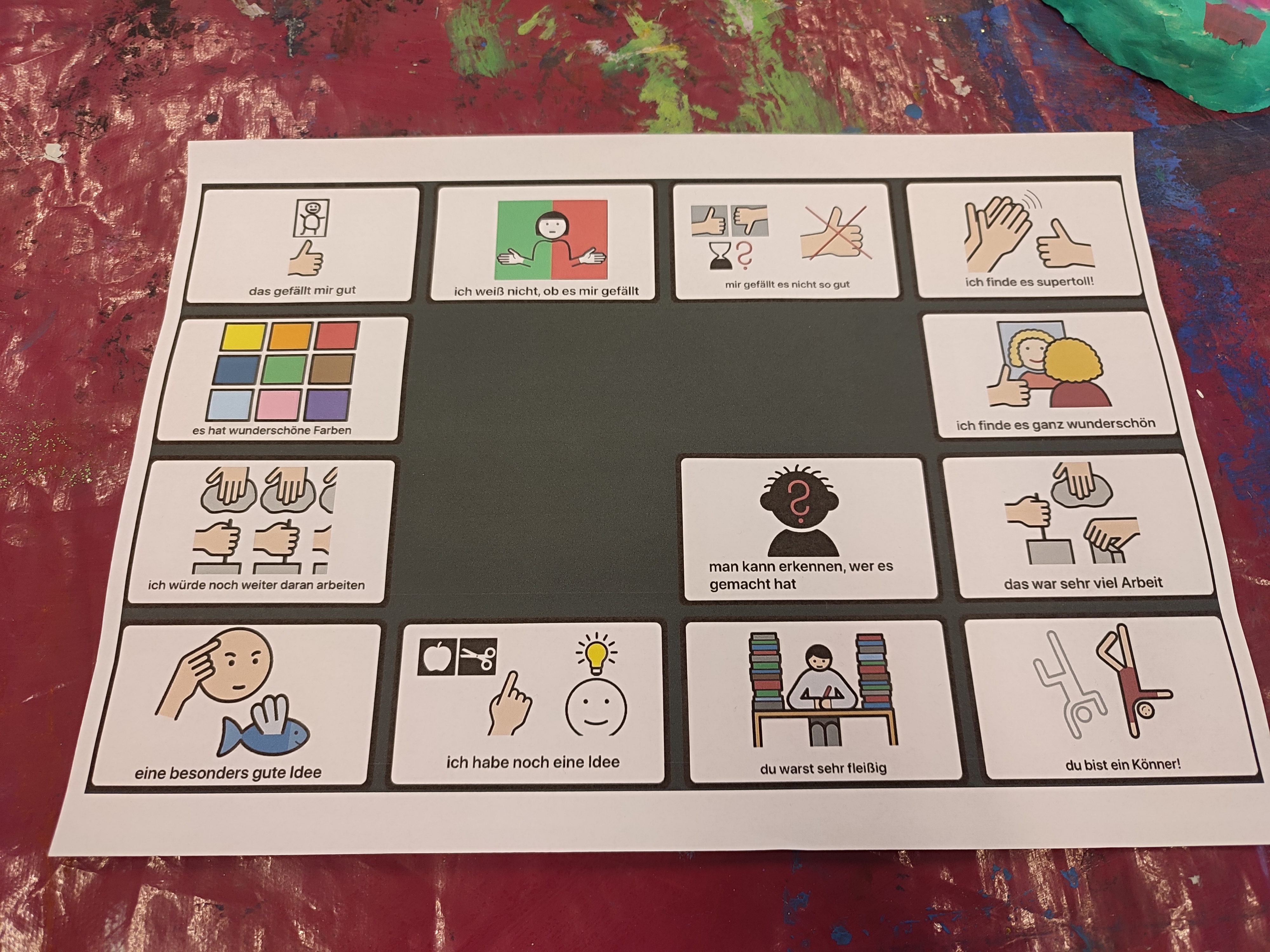 Nicht-sprechende Schüler*innen konnten sich mithilfe ihres Talkers mitteilen und so genau kundtun, welche Werke sie schaffen möchten. Auf die gleiche Weise konnten andere Personen Rückmeldungen zur Ausstellung geben. Aber auch liebevolle Text-Kommentare sind zu finden.