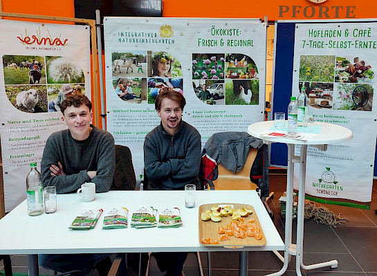 Neben dem Thema Arbeit gab es, wie in den Jahren vor Corona auch, wieder Infostände zu den Themen Freizeit, Wohnen, gesetzliche Betreuung / Beratung und Zukunftsplanung. Dabei waren Stände von innerhalb der Lebenshilfe, wie hier die Rechtliche Betreuung (li.) mit Christian Then und Daniela Kratzer, sowie von außerhalb der Lebenshilfe wie beispielsweise der Naturgarten Schönegge (re.) vertreten.