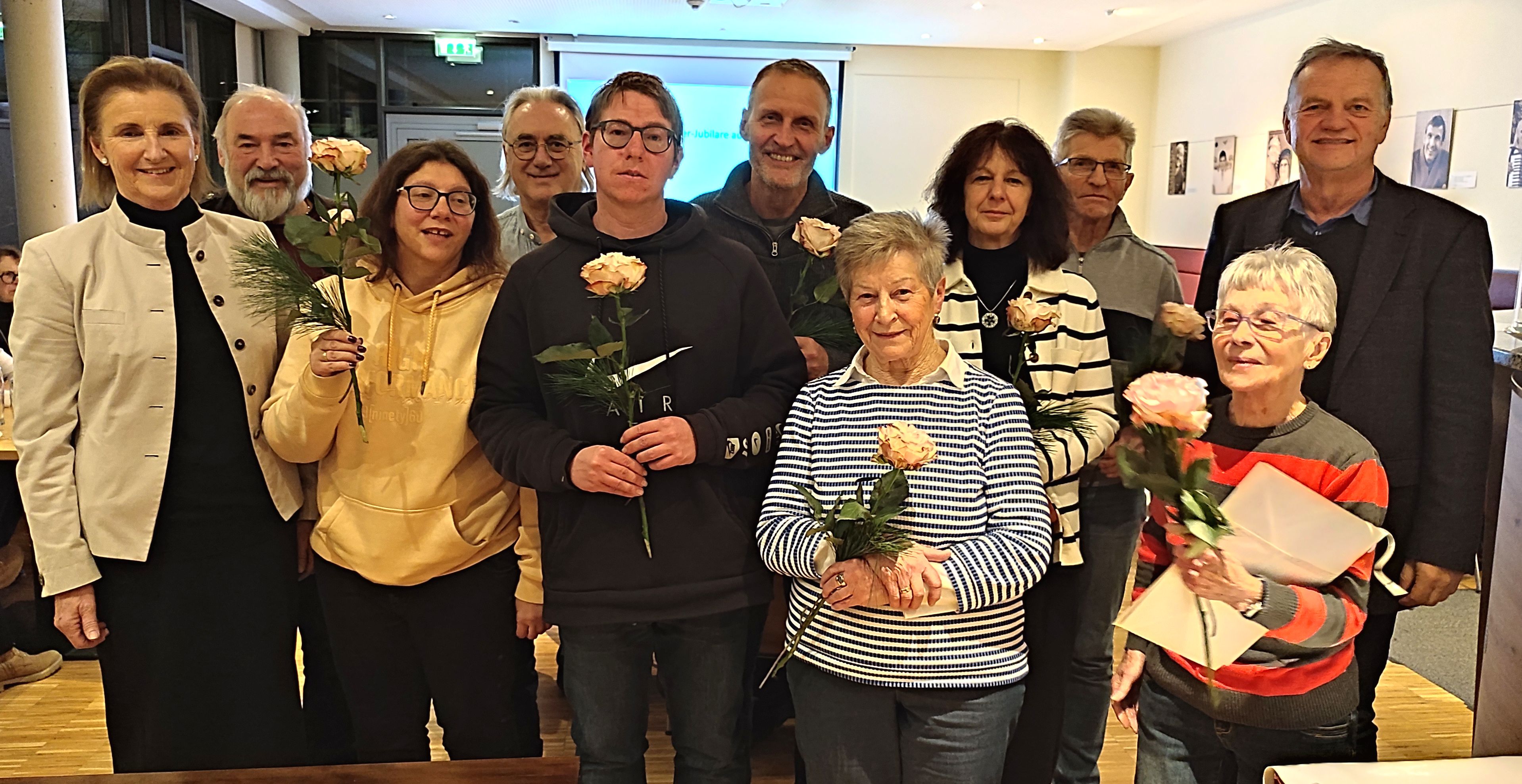 Stellvertretende Vorstandsvorsitzende, Monika Haslberger (links), und Vorstandsvorsitzender, Robert Wäger (rechts), gratulierten den Ehrenjubilaren (v.l.n.r.) Hermann Diemer (50 Jahre), Anja Lackner (10 Jahre), Heinz Geiger (20 Jahre), Stephan Kraus (10 Jahre), Erich Winklhofer (10 Jahre), Heidi Sieber (50 Jahre), Angelika Fech (25 Jahre), Karl-Heinz Kiefer (10 Jahre) und Brigitte Kiefer (10 Jahre) zu ihrer langjährigen Mitgliedschaft bei der Lebenshilfe Freising. Die nicht anwesenden Jubilare erhalten ihre Ehrenurkunde auf dem Postweg.