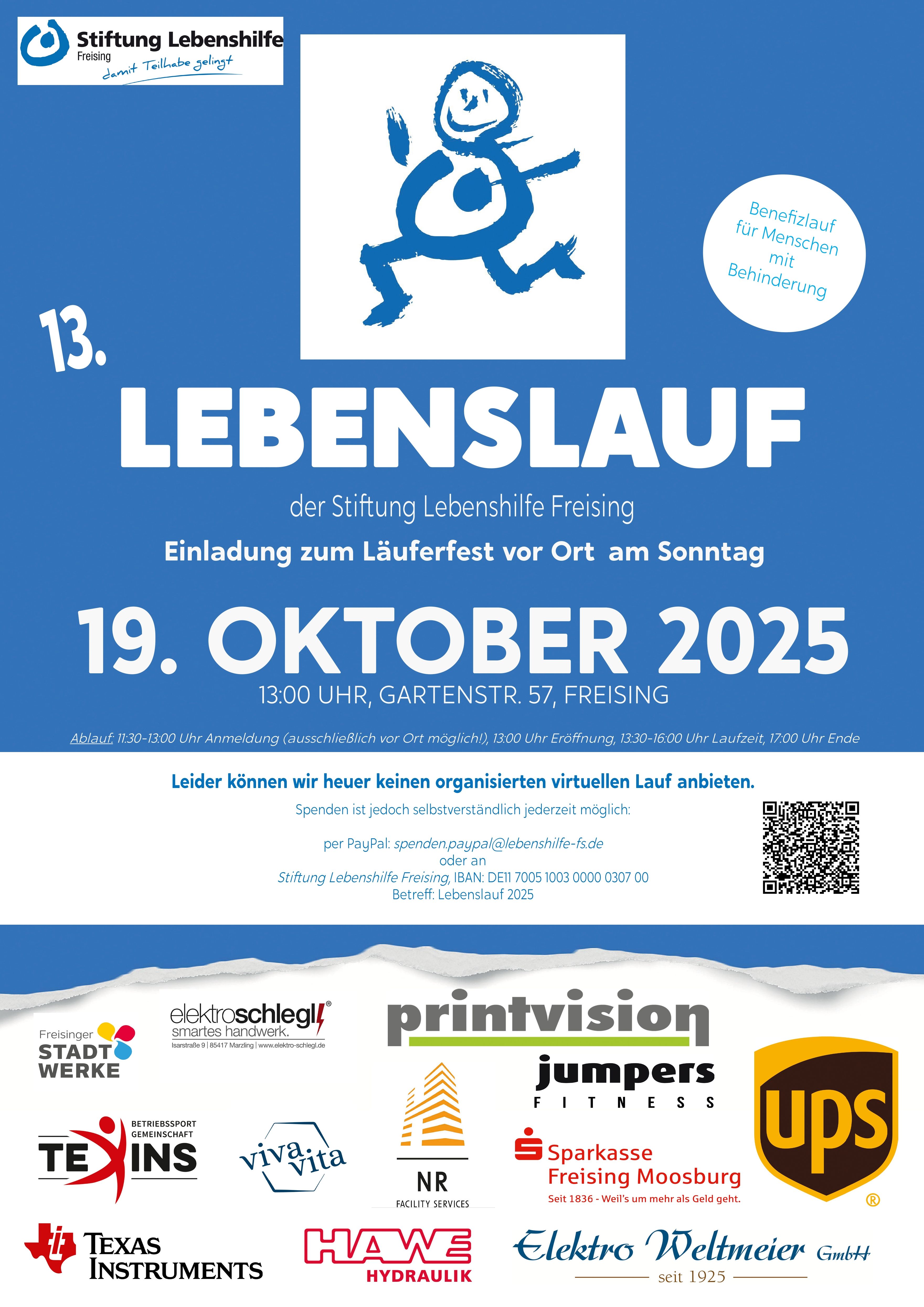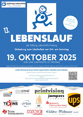 Die Stiftung Lebenshilfe Freising veranstaltet am Sonntag, den 19. Oktober 2025, ihren mittlerweile 13. Lebenslauf, der auch in diesem Jahr Menschen jeden Alters dazu einlädt, für den guten Zweck aktiv zu werden. Ob Spender*in, Kilometer-Finanzierer*in oder Läufer*in – jede Person kann einen Beitrag leisten, um Menschen mit Behinderung in unserer Region zu unterstützen.