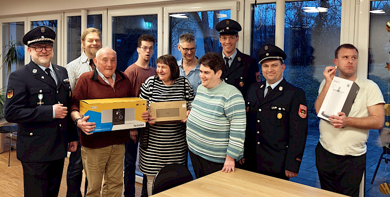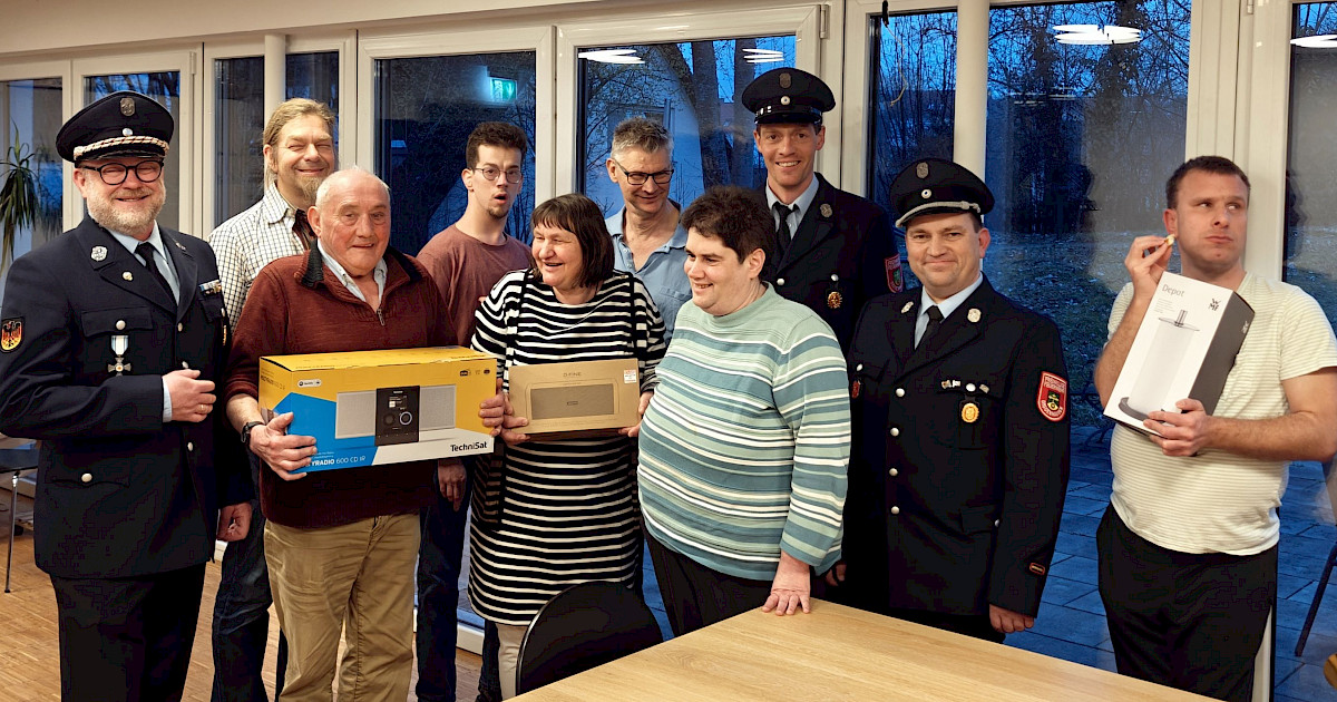 Eingefädelt von Heilerziehungspfleger Stephan Taschner kamen zur Spendenübergabe 1. Vorstand Christian Fiedler (li. in Uniform), Ausschussmitglied des Feuerwehrvereins Philip Nadler (Mitte in Uniform) sowie 1. Kommandant Thomas Nadler (re. in Uniform). Über die Sachspenden freuen sich stellvertretend für alle HAH-Bewohner*innen Karl-Heinz Kerschner, Annemarie Döbl, Johannes Herold, Joachim Grund, Michaela Rieger und Stephan Humpelmaier zusammen mit dem Leiter des Wohnhauses Günther Schwab (2.v.li.).