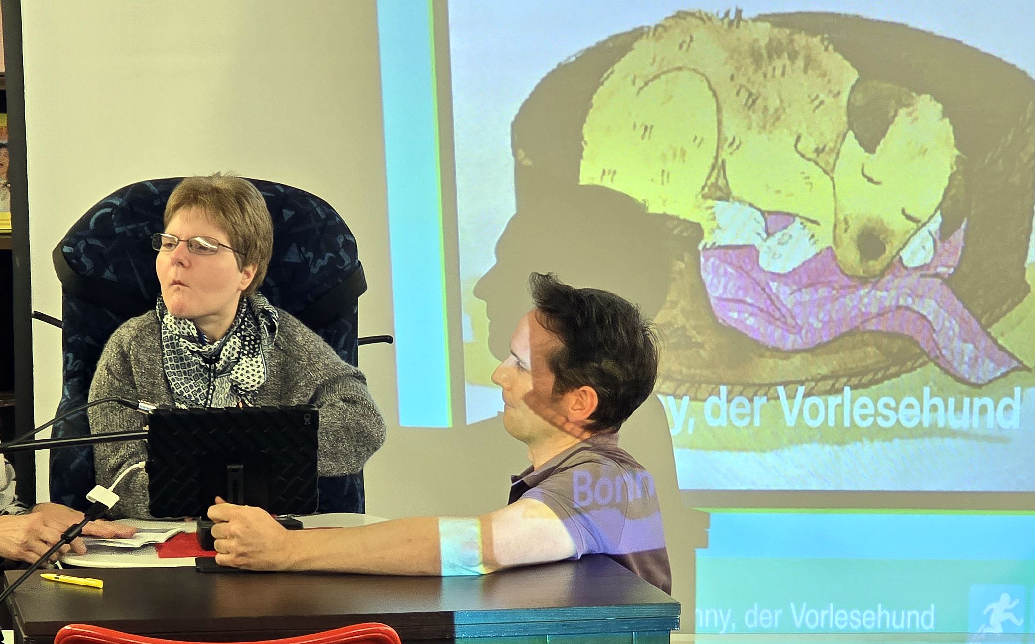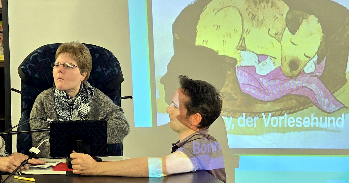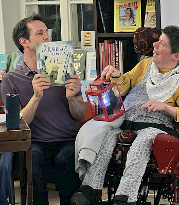 Die Teilnehmer*innen der Förderstätte – Wilfried Schraufstetter, Doris Ehlert und Theresa Schwarzbözl – begeisterten das Publikum mit eigenen Texten, Geschichten und Gedichten. Unterstützt wurden sie dabei von Sprachausgabegeräten und einer Kommunikations-App auf dem iPad (GoTalk), die es auch Menschen mit eingeschränkter Lautsprache ermöglichen, aktiv am Austausch teilzunehmen.