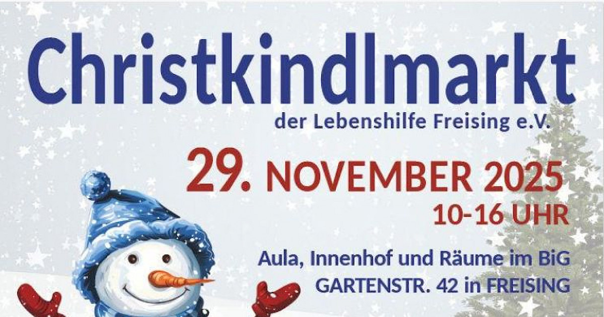Am Samstag, den 29. November 2025 öffnet der liebevoll gestaltete Christkindlmarkt der Lebenshilfe Freising von 10:00 bis 16:00 Uhr wieder seine Pforten im Bildungszentrum Gartenstraße. Damit findet die Veranstaltung nach dem großen Erfolg vergangenes Jahr nun zum zweiten Mal seit der Corona-Pause statt. Der Verein freut sich auf interessierte Besucher*innen.