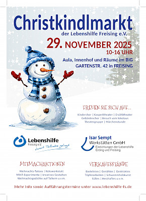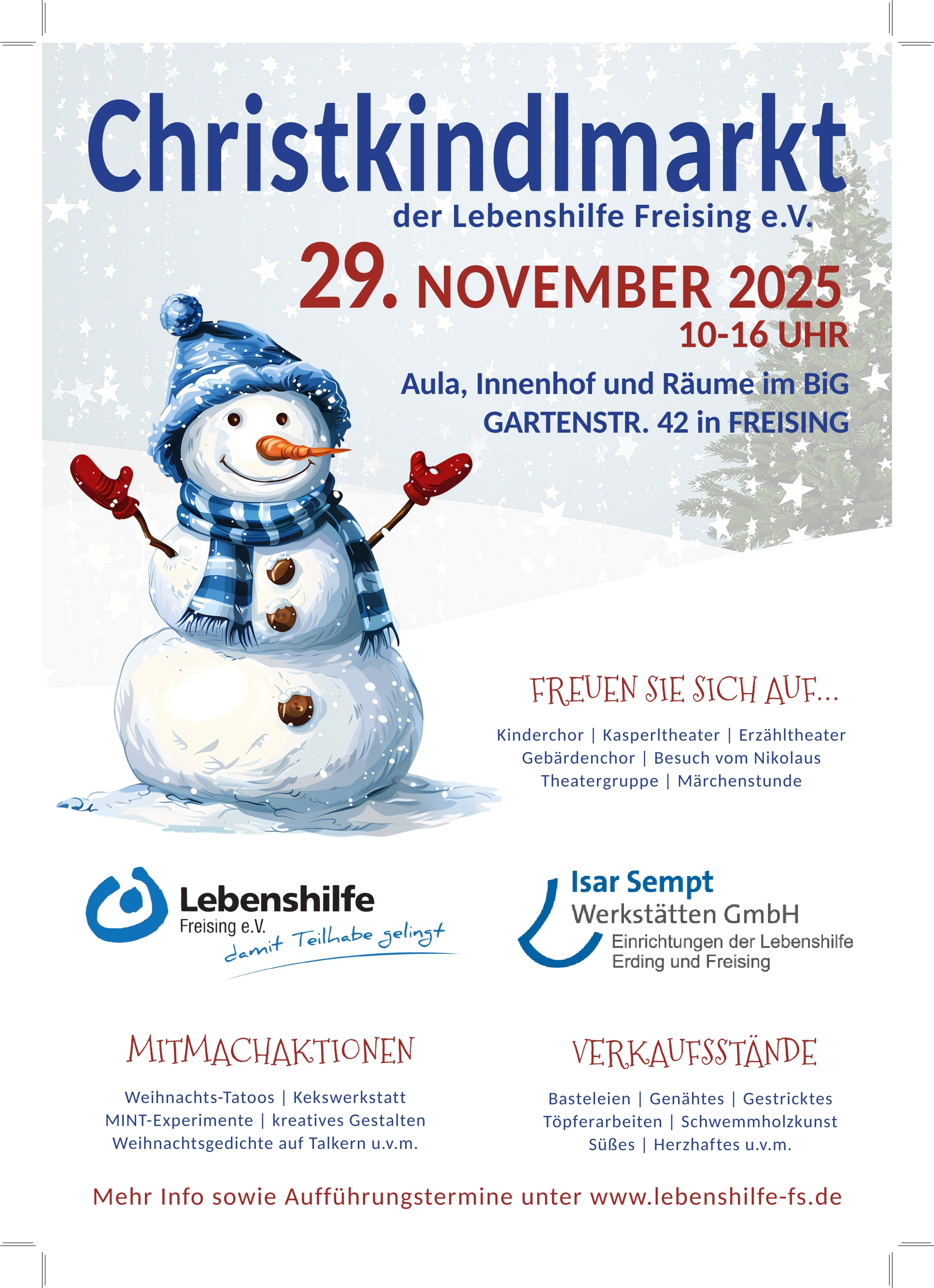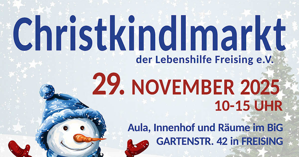 Der Christkindlmarkt der Lebenshilfe Freising verbindet weihnachtliche Atmosphäre mit sozialem Engagement. Die Erlöse aus den Verkäufen kommen den vielfältigen Angeboten der Lebenshilfe zugute – von inklusiver Kinderbetreuung über Assistenzleistungen im Alltag bis hin zu Freizeit- und Bildungsangeboten für Menschen mit Behinderung.